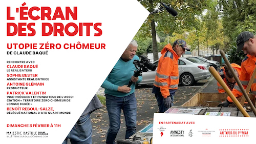 La projection sera suivie d’une discussion avec Claude Baqué (réalisateur), Sophie Bester (assistante réalisatrice), Antoine Glémain (producteur), Patrick Valentin (Vice-président et fondateur de l’association « Territoire Zéro Chômeur de Longue Durée ») et Benoît Reboul-Salze (délégué national d’ATD Quart Monde).